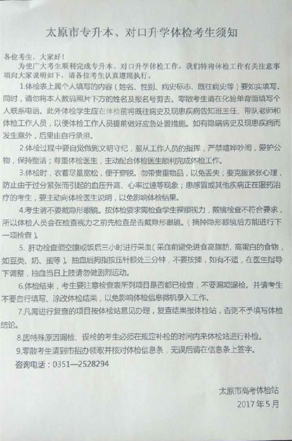 经与太原市招办协调安排,现将我院专升本考生体检等相关事宜事项通知如下: