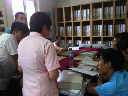 下午3点,老师和队员们来到了社区卫生站,在社区卫生站,卫生站负责人接待了大家并给大家简单地介绍了社区的基本人员情况,也让大家了解到现阶段社区卫生站的建设情况,而后在卫生站负责人的指导下老师和同学开始帮助整理社区医疗卫生档案。