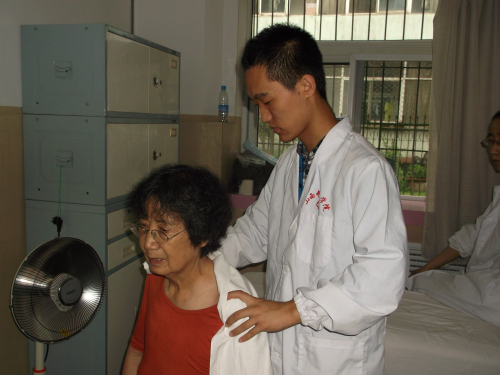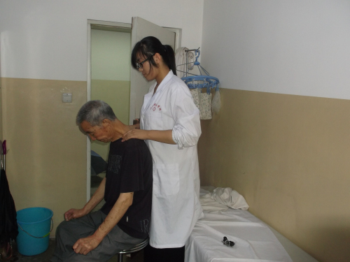 在第一、二天,我们主要进行了宣传活动,向附近的居民和在校老师介绍了按摩知识,同时也教了他们一些推拿保健方法,以及一些中医养生之道。经过简单的宣传之后,老师和居民对中医和推拿产生了浓烈兴趣。接下来四天里,有不少的居民老师前来就诊,我们接触的病人以腰腿疼痛为主,也有肩周炎、颈椎病患者。这些病症让我们推拿手法有了用武之地,同时也让大家对推拿、对临床有了进一步的了解,真是实践出真知啊。由于老年人体内阳气衰少,所以艾灸也是我们重要治疗手法之一,如消化不好,艾灸足三里、天枢等,这也让大家对穴位有了深刻了解。