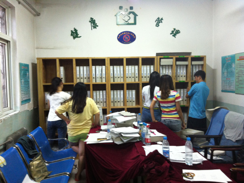 利用暑期时间深入基层社区医疗卫生机构,感受基层医疗文化建设。7月8日,“水漫龙城”,大雨使得交通拥堵,实践队员们一大早便冒着大雨从中医学院来到了卫生站,雨水并没有打消队员们的热情,大家仔细地核对昨天收集到的材料并进行档案记录。